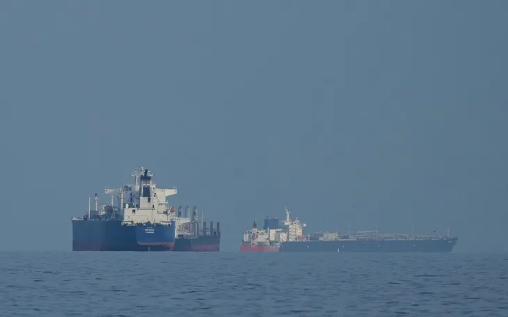Các tàu chở dầu và tàu chở hàng xếp hàng dài ở eo biển Hormuz (Ảnh: AP)