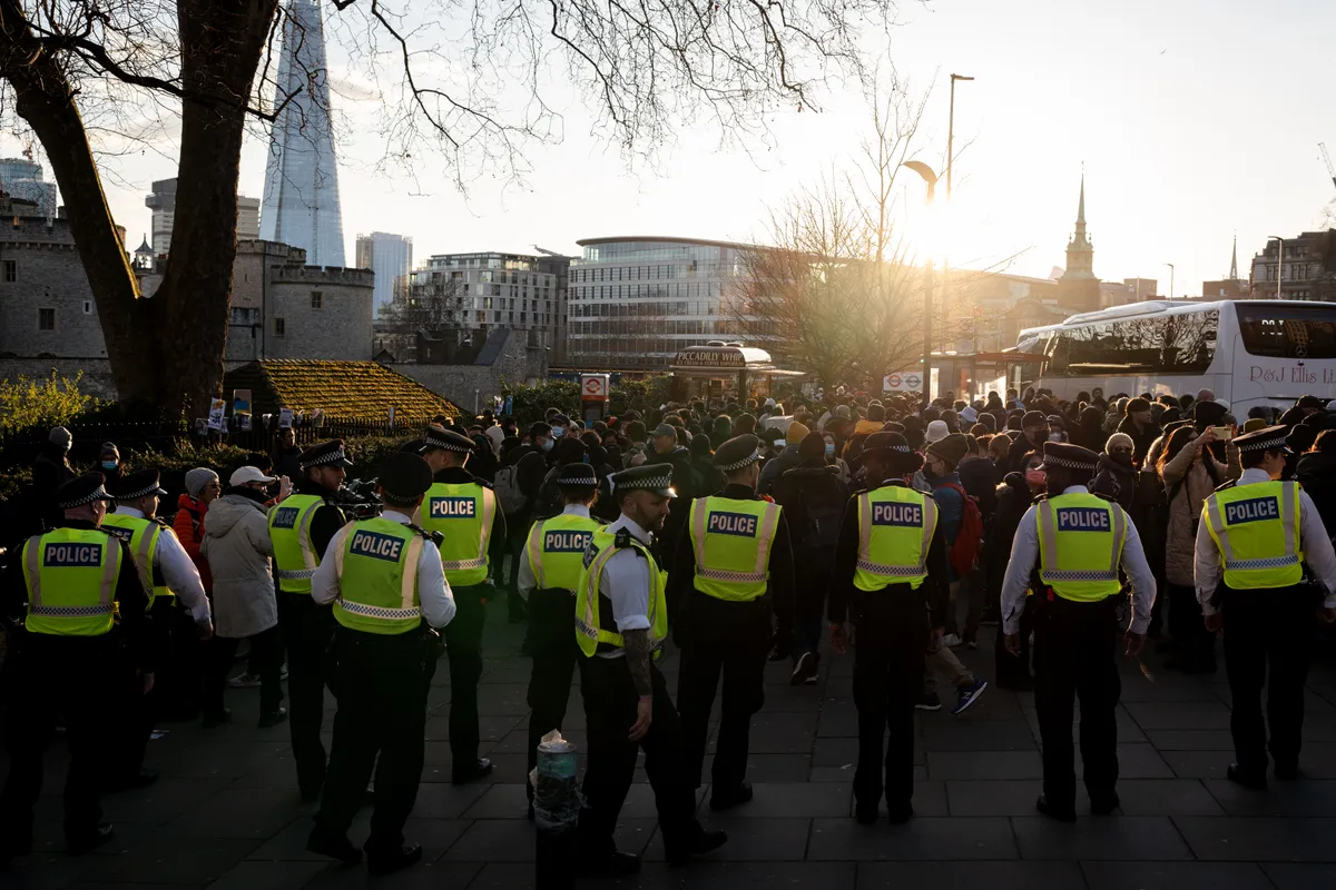 Cảnh sát làm nhiệm vụ trong cuộc biểu tình phản đối kế hoạch xây đại sứ quán Trung Quốc tại Royal Mint Court, London, ngày 15/3/2025 (Ảnh: SOPA Images/Reuters)