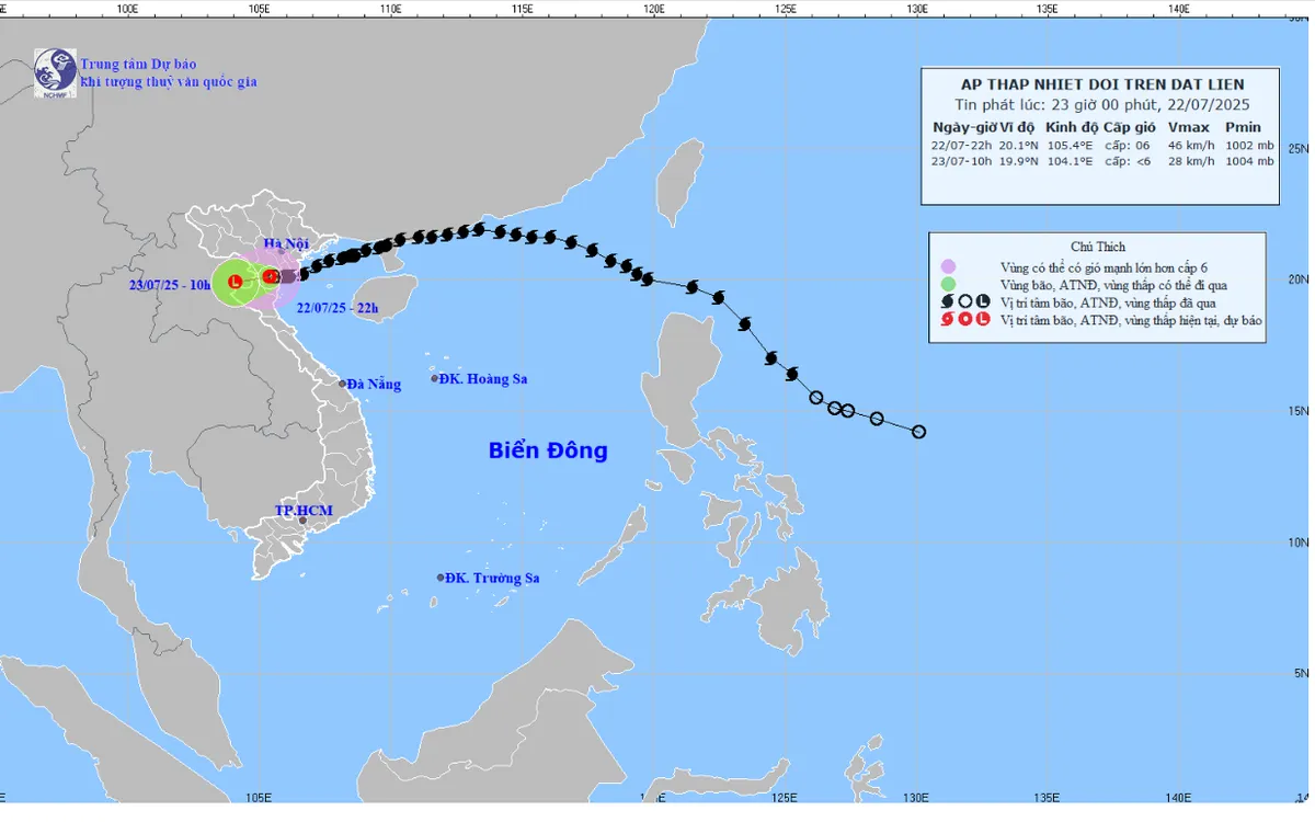Dự báo đến 10h ngày 23/7, áp thấp nhiệt đới ở khoảng 19,9°N; 104,1°E; di chuyển theo hướng Tây Tây Nam với tốc độ khoảng 10km/h, suy yếu dần thành vùng áp thấp. Cường độ: dưới cấp 6.