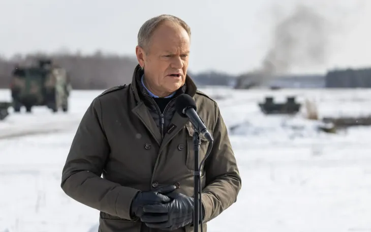 Thủ tướng Ba Lan Donald Tusk phát biểu tại thị trấn Zielonka, gần thủ đô Warsaw, ngày 19/2/2026 (Ảnh: AFP)