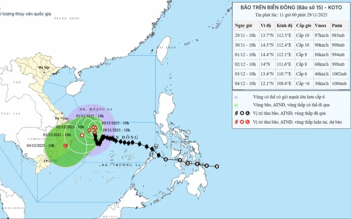 Theo Trung tâm Dự báo khí tượng thủy văn Quốc gia, hồi 10h ngày 29/11, vị trí tâm bão ở vào khoảng 13,7 độ Vĩ Bắc; 112,3 độ Kinh Đông, trên vùng biển phía Tây Bắc khu vực Giữa Biển Đông. Sức gió mạnh nhất vùng gần tâm bão mạnh cấp 9-10 (75-102km/h), giật cấp 13. Di chuyển theo hướng Bắc, tốc độ khoảng 5km/h.