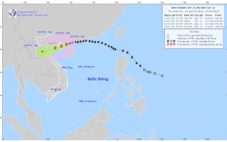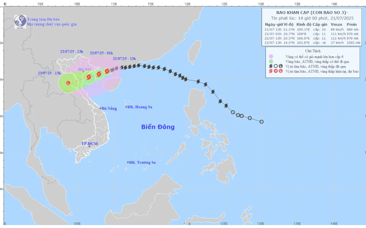 Từ tối và đêm 21/7: vùng ven biển từ Quảng Ninh đến Nghệ An có gió mạnh cấp 7–9, vùng gần tâm bão cấp 10–11, giật cấp 14.