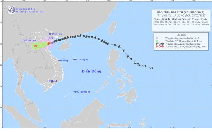 Vào lúc 16h ngày 22/7, vị trí tâm bão ở vào khoảng 20,1 độ Vĩ Bắc; 105,9 độ kinh Đông, trên đất liền các tỉnh Ninh Bình – Thanh Hoá. Sức gió mạnh nhất vùng gần tâm bão mạnh cấp 8 (62–74km/h), giật cấp 10, di chuyển theo hướng Tây với tốc độ 10-15 km/h.