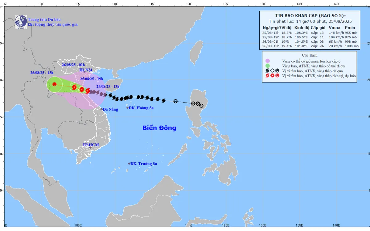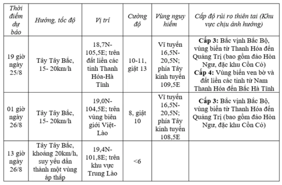 Từ chiều 25/8 đến hết ngày 26/8, ở khu vực trung du và đồng bằng Bắc Bộ, khu vực Lào Cai, Sơn La và từ Thanh Hóa đến Quảng Trị có mưa lớn diện rộng với lượng mưa phổ biến 70-150mm, cục bộ có nơi trên 250mm; riêng khu vực Thanh Hóa đến Bắc Quảng Trị có mưa to đến rất to với lượng mưa phổ biến 150-350mm, cục bộ có nơi trên 500mm. Cảnh báo nguy cơ mưa có cường suất lớn (>200mm/3h).