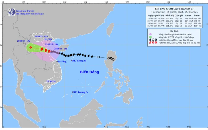 Hồi 13 giờ ngày 25/8, vị trí tâm bão ở vào khoảng 18,5 độ Vĩ Bắc; 106,3 độ Kinh Đông, trên vùng biển ven bờ khu vực Nghệ An-Hà Tĩnh. Sức gió mạnh nhất vùng gần tâm bão mạnh cấp 13 (134-149km/giờ), giật cấp 16; di chuyển theo hướng Tây Tây Bắc với tốc độ 15-20km/giờ.