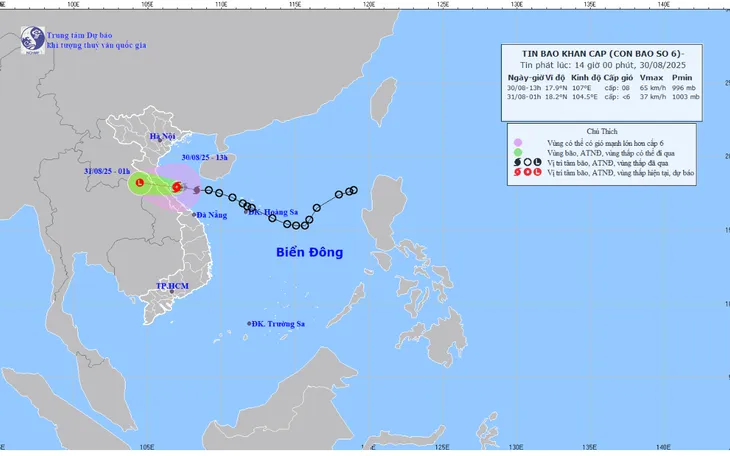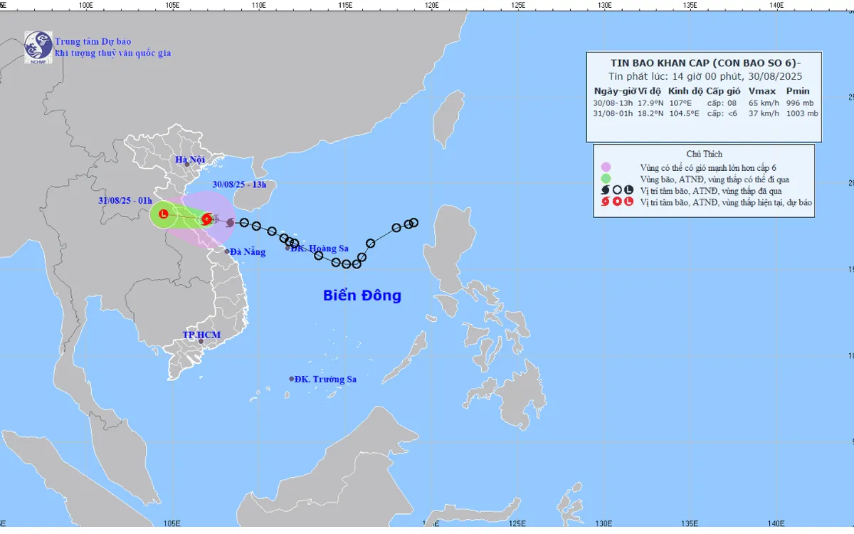 Hồi 13h ngày 30/8, tâm bão ở 17,9°N - 107,0°E (ven biển Hà Tĩnh - Quảng Trị). Gió mạnh nhất cấp 8 (62 - 74 km/h), giật 10 - 11. Bão di chuyển hướng Tây, tốc độ 20 - 25 km/h.