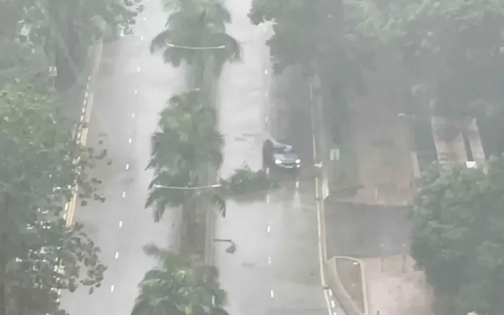 Một chiếc ô tô di chuyển qua cành cây đổ khi bão Tapah quét qua Hong Kong (Trung Quốc) sáng 8/9/2025 (Ảnh: AP)