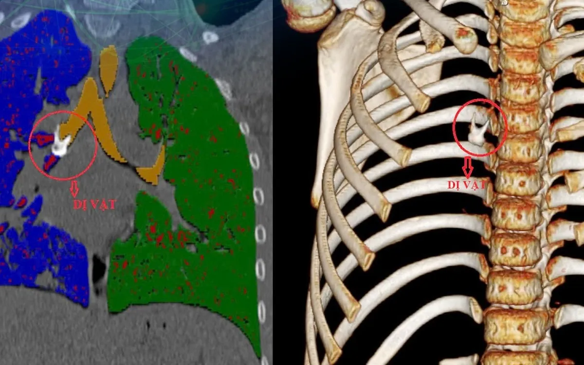 Qua thăm khám và xét nghiệm, trẻ được chẩn đoán viêm phổi nặng, cần nhập viện điều trị. Kết quả chụp CT ngực khiến gia đình "giật mình" khi phát hiện dị vật có hình dạng giống răng nằm trong phế quản phải. Dị vật gây bít tắc hoàn toàn khẩu kính phế quản trung gian, khiến niêm mạc phế quản xung huyết, phù nề - lý giải nguyên nhân bé ho kéo dài và viêm phổi tái diễn. Sau khi nội soi phế quản, bác sĩ gắp ra dị vật chính là một chiếc răng.