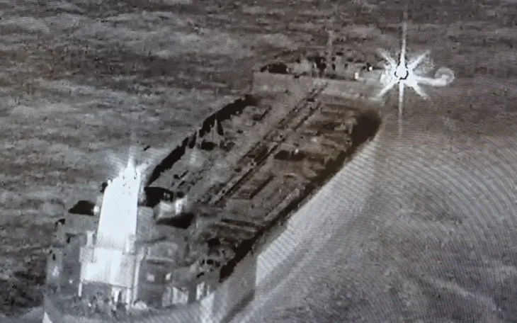 Hình ảnh tàu Ethera trong buổi họp báo của Bộ Quốc phòng Bỉ về Chiến dịch Blue Intruder, tại căn cứ hải quân ở Zeebrugge, ngày 1/3/2026 (Ảnh: AFP)