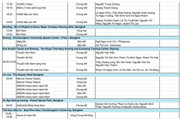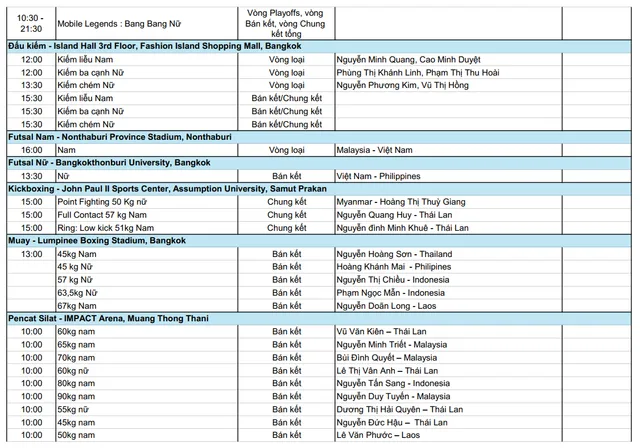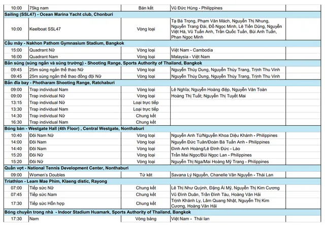 Lịch thi đấu của đoàn Thể thao Việt Nam ngày 16/12.