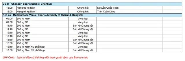 Các VĐV của Việt Nam Nguyễn Văn Hiếu, Nguyễn Thị Vân Anh, Phạm Thị Bích Ngọc, Phạm Thị Huệ, Triệu Hoàng Long, Bùi Văn Hoàn, Nguyễn Văn Hà, Nguyễn Hữu Thành, Phạm Thị Ngọc Anh, Lê Thị Hiền, Hà Thị Vui và Dư Thị Bồng thi đấu chung kết các nội dung từ 9h12h hôm nay.