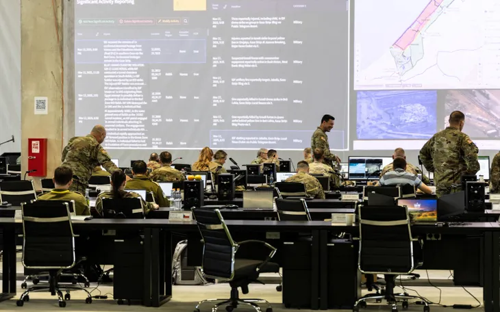 Binh sĩ Mỹ và Israel tập trung tại Trung tâm Điều phối dân sự - quân sự (CMCC) (Ảnh: Reuters)