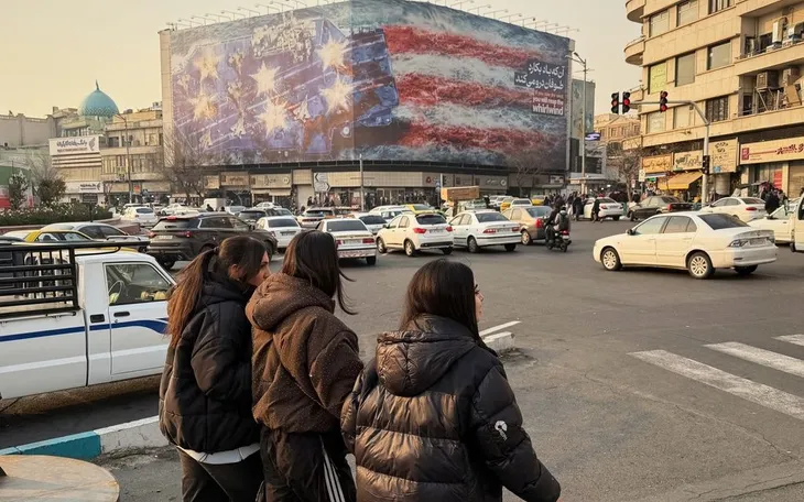 Người dân đi qua bảng quảng cáo mô phỏng tàu sân bay Mỹ tại Quảng trường Cách mạng Hồi giáo ở Tehran, Iran, ngày 25/1/2026 (Ảnh: AP)