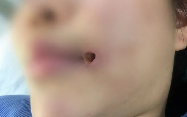 Bệnh nhân nữ, 21 tuổi, trú tại Lạng Sơn, có tiền sử tiêm filler cách đây khoảng 1 năm. Trước nhập viện 2 ngày, vùng má trái xuất hiện sưng đau và chảy mủ. Người bệnh tự ý dùng dao lam rạch để thoát mủ tại nhà, khiến tổn thương lan rộng khoảng 3x5cm, gây loét, hạn chế há miệng và ảnh hưởng thẩm mỹ khuôn mặt.