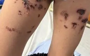 Mười ngày sau, do vết thương không cải thiện, bệnh nhi được đưa đến bệnh viện trong tình trạng bỏng độ 2-3 vùng mông, tầng sinh môn và hai bên đùi. Vết thương nhiễm trùng nặng, xuất hiện hoại tử đen, rỉ dịch mủ. Các tổn thương dạng giọt bắn tạo thành mảng vảy khô, bên dưới có mủ. Bệnh nhi đã phải phẫu thuật cắt bỏ tổ chức hoại tử, thay băng hằng ngày, dùng kháng sinh và giảm đau.