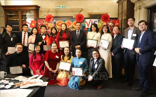 Đại sứ Đỗ Minh Hùng chụp ảnh lưu niệm với các thành viên đạt giải thưởng của Hội trí thức Việt Nam tại Vương quốc Anh và Ireland tại Lễ hội Tết Nguyên đán Bính Ngọ 2026. (Ảnh: TTXVN)