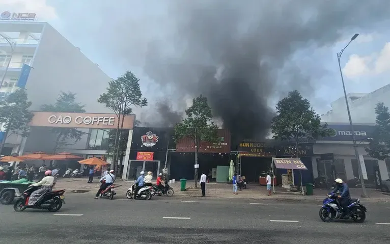 Quán Ếch 62 trên đường Hùng Vương bốc cháy, khói đen bốc lên cao. (Ảnh: PLO)