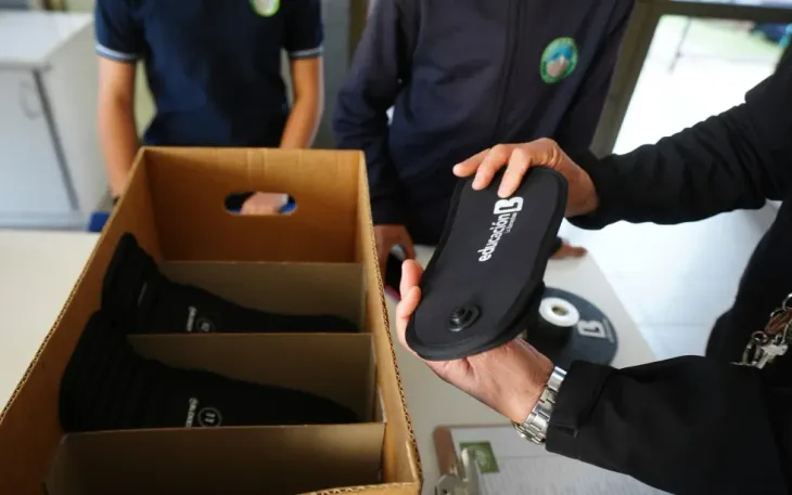 Một giáo viên phát thiết bị chặn tín hiệu để học sinh đặt điện thoại vào trong chương trình thí điểm hạn chế dùng điện thoại tại trường Bicentenario ở Santiago, Chile, ngày 8/9/2025 (Ảnh: AP)
