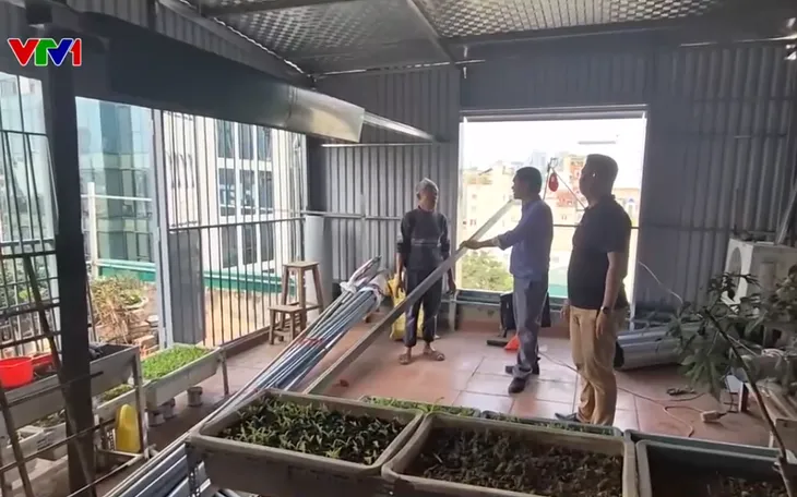 Không chỉ có sân vườn, nhiều diện tích đã bị quây kín bằng tôn chống nóng, rất có thể những căn hộ đã được cơi nới bên trong. Có nhà còn dựng cả ròng rọc, đang vận chuyển vật liệu thi công lên. Từ trên cao có thể thấy, có gần chục nhà tôn đã được cơi nới khắp trên tầng thượng khu tập thể.