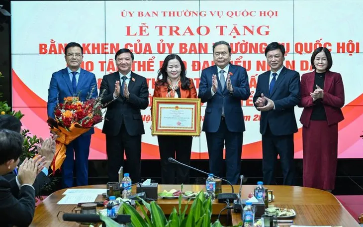 Chủ tịch Quốc hội Trần Thanh Mẫn trao bằng khen của Ủy ban Thường vụ Quốc hội cho Báo Đại biểu Nhân dân. (Ảnh: Nhân dân)