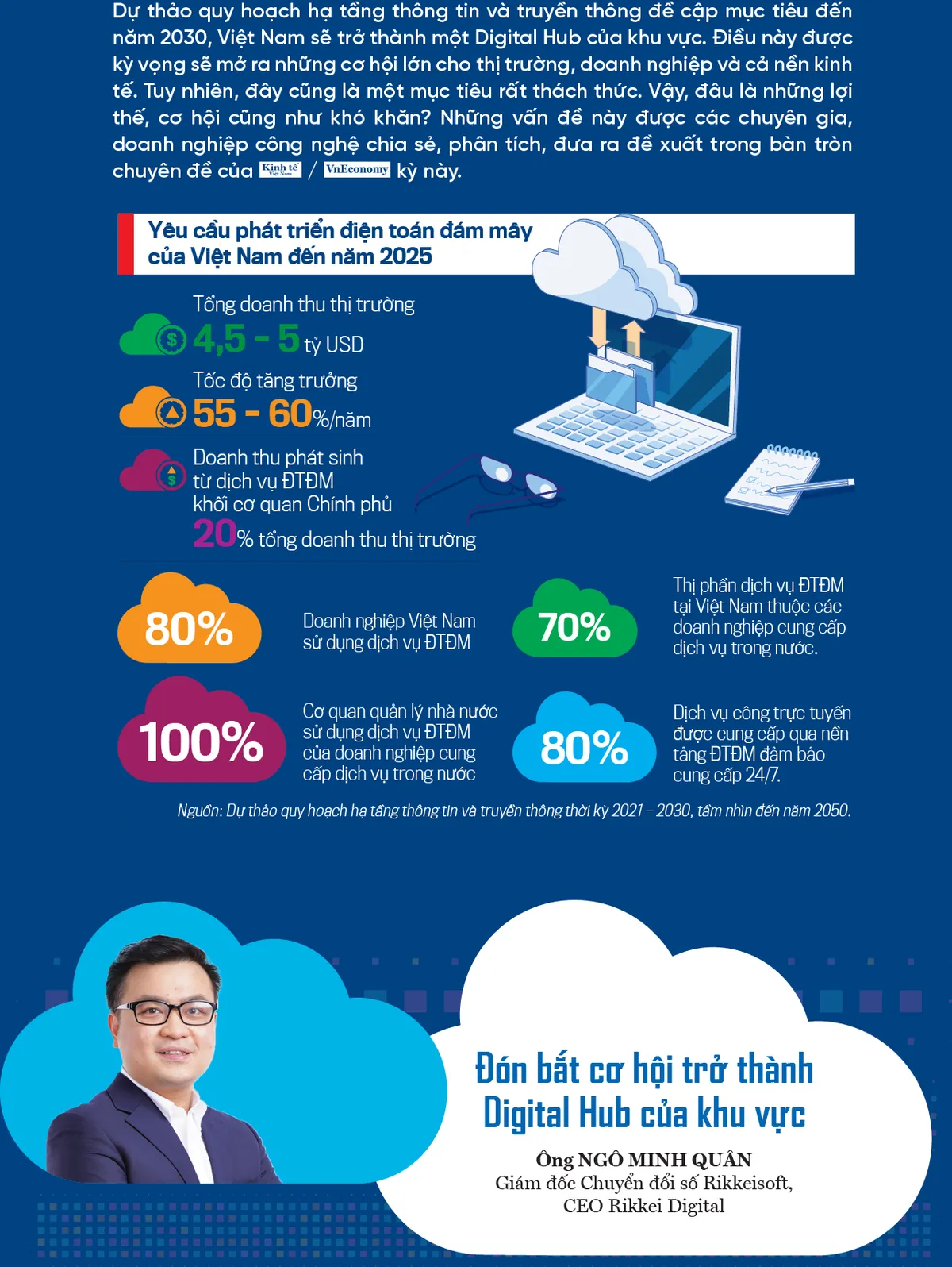 “Khi Việt Nam trở thành Digital Hub sẽ mở ra những cơ hội lớn với thị trường nội địa. Bởi thực tế hiện nay, có tới 80% tổ chức doanh nghiệp đang sử dụng các dịch vụ công nghệ đám mây của các “ông lớn” nước ngoài.