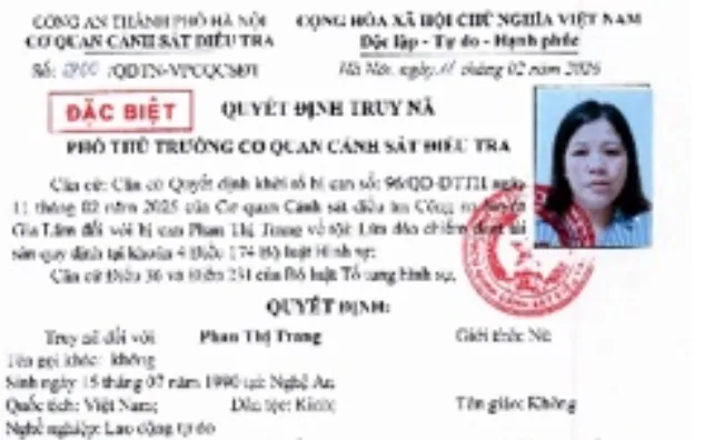 Ngày 11/02/2026, Cơ quan Cảnh sát điều tra CATP Hà Nội đã ra quyết định truy nã bị can đối với Phan Thị Trang.