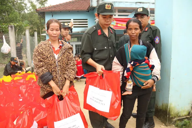 Chiến sĩ Cảnh sát cơ động Công an TP Hồ Chí Minh trao quà hỗ trợ bà con đồng bào thiểu số bị ảnh hưởng bão lũ. Ảnh: Sơn Khải - Công an TP Hồ Chí Minh.