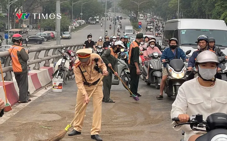 Khoảng 7h00 cùng ngày, Đội CSGT đường bộ số 4 tiếp nhận thông tin người dân phản ánh tại khu vực cầu vượt Trần Khắc Chân (hướng Đại Cồ Việt đi Nguyễn Khoái) xuất hiện vết dầu loang kéo dài khoảng 50m trên mặt cầu, khiến một số phương tiện xe máy di chuyển qua khu vực bị ngã do trơn trượt, tiềm ẩn nguy cơ mất an toàn giao thông.