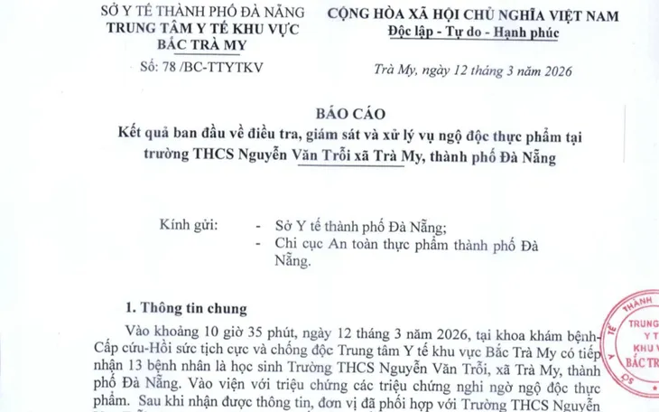 Ngày 13/3, Trung tâm y tế khu vực (TTYT KV) Bắc Trà My, TP Đà Nẵng cho biết, đơn vị đã có báo cáo kết quả ban đầu vụ ngộ độc thực phẩm tại Trường THCS Nguyễn Văn Trỗi, xã Trà My, TP Đà Nẵng.