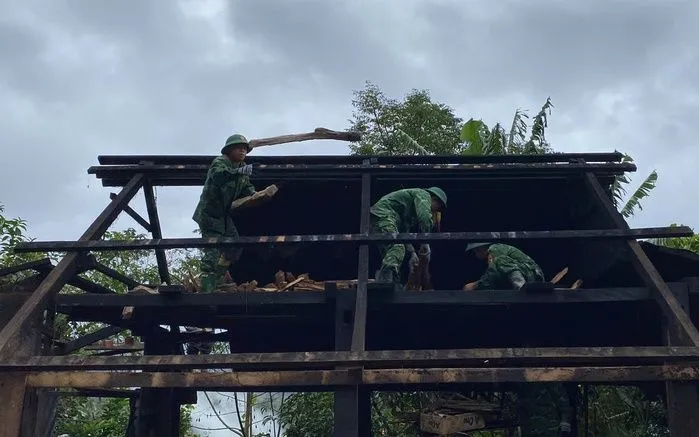 Cán bộ, chiến sĩ Biên phòng tổ chức tháo dỡ, di dời 5 ngôi nhà ở thôn H'juh, xã Hùng Sơn về khu vực mới an toàn hơn.Ảnh: VGP