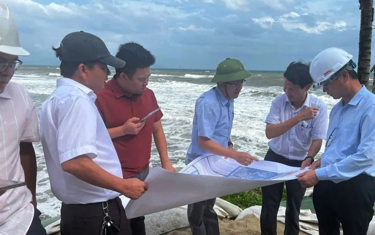 Sáng 20/10, Phó Chủ tịch UBND thành phố Đà Nẵng Trần Nam Hưng đến kiểm tra tình hình sạt lở bờ biển An Bàng do ảnh hưởng của cơn bão số 12 gây sóng mạnh và triều cường liên tục dội vào đất liền. (Ảnh: Đoàn Hữu Trung/TTXVN)