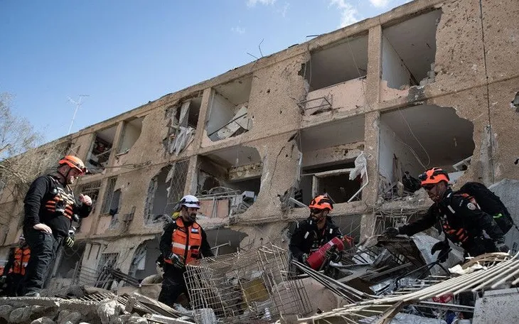 Lực lượng cứu hộ tại hiện trường vụ tấn công tên lửa của Iran xuống khu vực ở thành phố Dimona, Israel ngày 22/3. (Ảnh: THX/TTXVN)