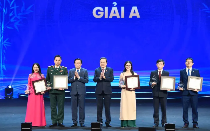 Ủy viên Bộ Chính trị, Chủ tịch Quốc hội Trần Thanh Mẫn và Ủy viên Bộ Chính trị, Bí thư Trung ương Đảng, Trưởng Ban Nội chính Trung ương Phan Đình Trạc trao Giải A cho các tác giả. (Ảnh: BTC)