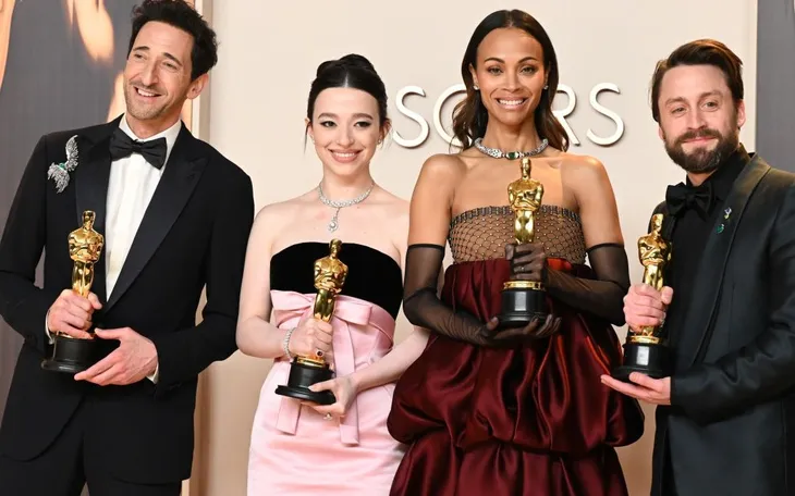 (Từ trái sang phải) Adrien Brody, Mikey Madison, Zoe Saldana, Kieran Culkin tại Lễ trao giải Oscar 2025 (Ảnh: Gilbert Flores)