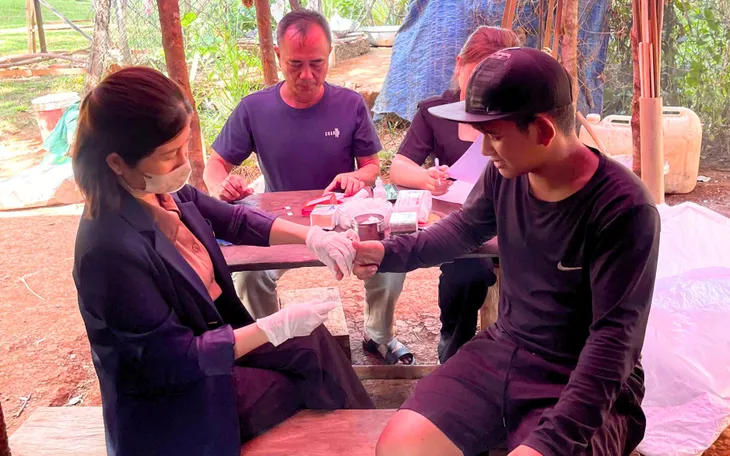Nhân viên CDC Đồng Nai thực hiện xét nghiệm máu sàng lọc sốt rét cho người dân xã Bù Gia Mập.