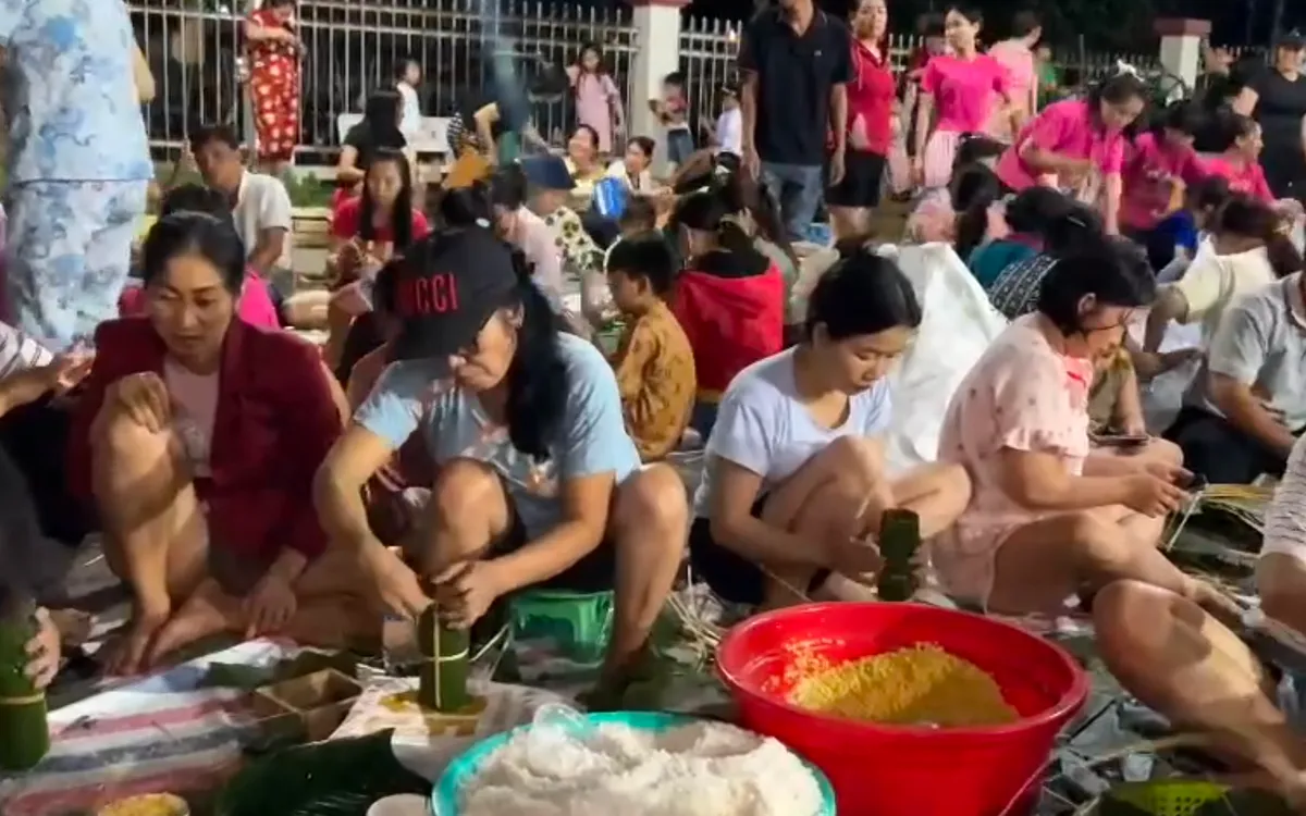 Khuôn viên Nhà văn hóa trở nên chật kín bởi lượng người đến hỗ trợ rất đông. Bên trong, hàng ngàn gói nhu yếu phẩm được đóng thùng, xếp cao hơn 2 mét. Bên ngoài, khoảng 100 người, từ người lớn tuổi đến thanh thiếu niên, tất bật gói bánh trong không khí khẩn trương.