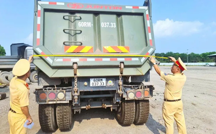 Lực lượng Cảnh sát giao thông Công an tỉnh Đồng Nai kiểm tra thực tế xe tải tự đổ, tập trung vào dấu hiệu cơi nới thành thùng và các điều kiện an toàn kỹ thuật trong đợt tổng kiểm tra phương tiện tải trọng lớn trên địa bàn.