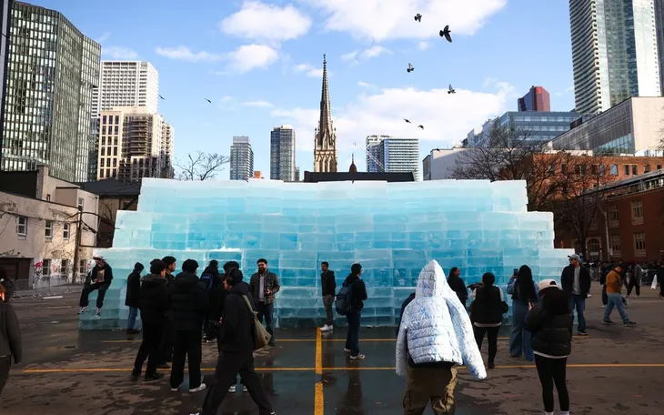 Mọi người tụ tập xung quanh những khối băng được lắp đặt trong một bãi đậu xe ở Toronto. Đây là một phần của chiến dịch quảng bá cho album sắp ra mắt của rapper Drake, "ICEMAN". (Ảnh: Cole Burston/The Canadian Press/AP)