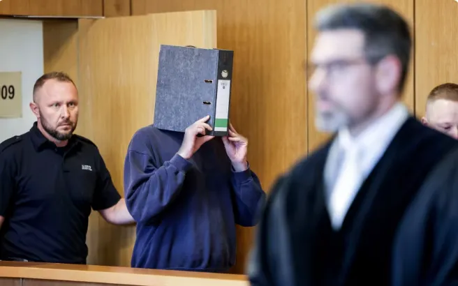 Bị cáo 44 tuổi được các luật sư của mình hộ tống tại tòa (Ảnh: DPA/Alamy Stock)