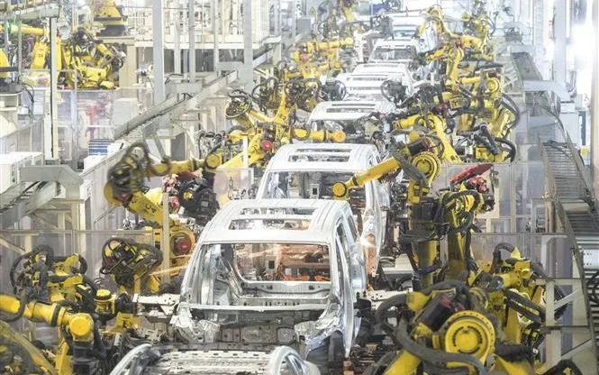 Robot lắp ráp xe ô tô điện của hãng Voyah tại Vũ Hán, tỉnh Hồ Bắc (Trung Quốc) ngày 1/4/2024. Ảnh: THX/TTXVN