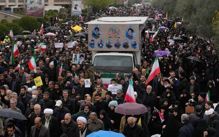 Người dân Iran đưa tiễn Bộ trưởng Tình báo Esmail Khatib - người mới thiệt mạng trong cuộc không kích của Mỹ - Israel, tại Tehran, ngày 20/3/2026. (Ảnh AP/Vahid Salemi)