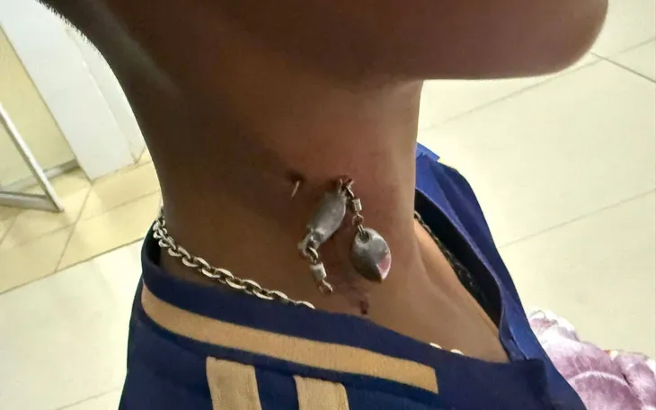 Sau thăm khám, bác sĩ xác định đây là tình huống tiềm ẩn nguy cơ cao do vùng cổ tập trung nhiều mạch máu lớn và dây thần kinh quan trọng. Nếu xử trí không đúng cách có thể gây chảy máu nặng hoặc để lại di chứng.