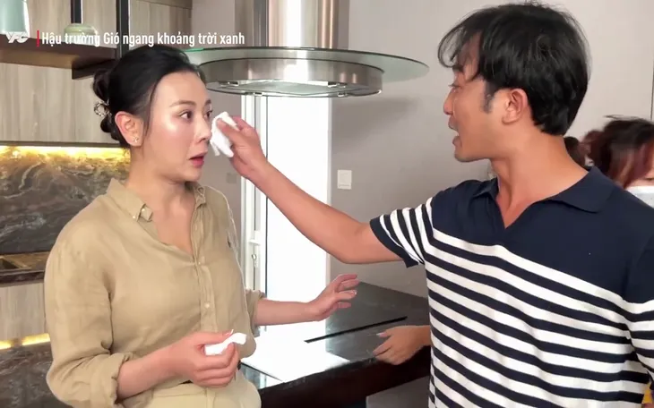 Ở hậu trường, sau khi cả hai cùng rơi nước mắt, Doãn Quốc Đam vừa trao đổi về cảnh diễn chung với Phương Oanh, vừa lau nước mắt cho bạn diễn.
