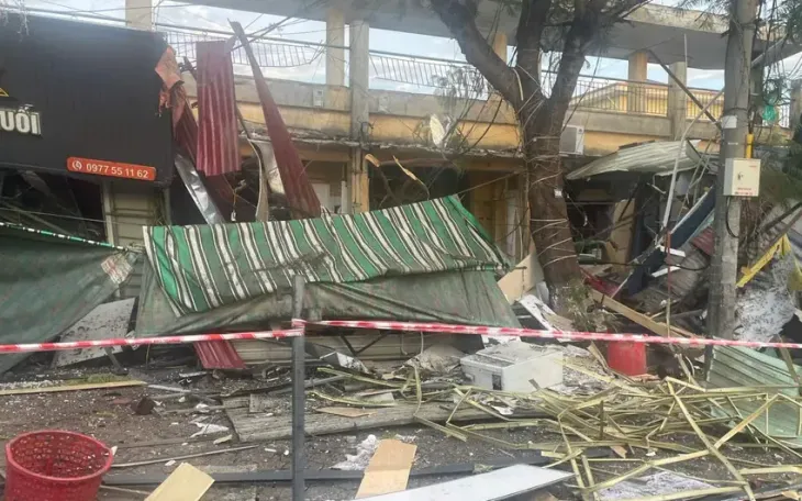 Vụ nổ khiến anh T. bị bỏng, phải đưa đi cấp cứu. Quán ăn và hai quán trà sữa, ăn vặt liền kề bị hư hại.
