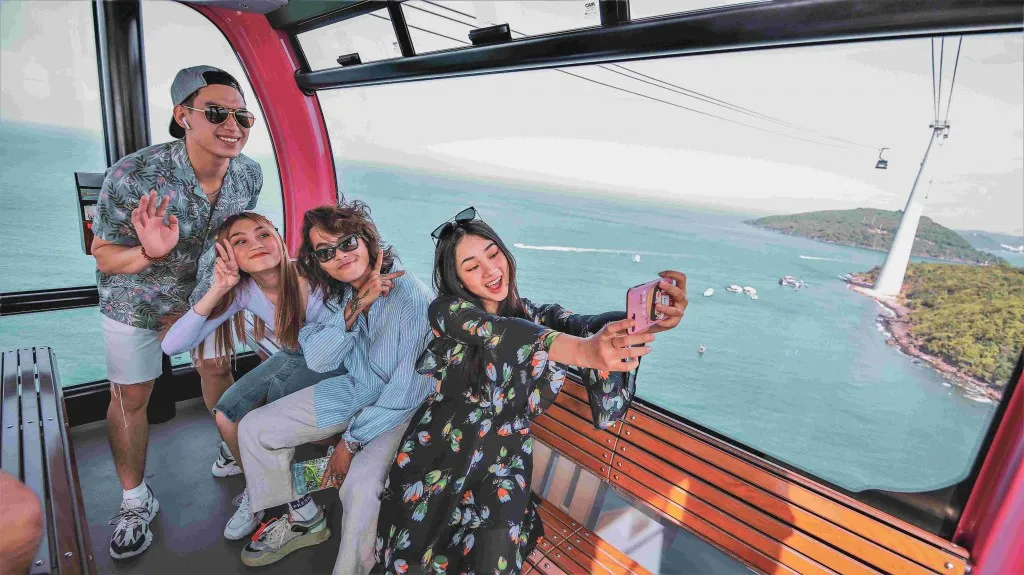 Du khách trải nghiệm hành trình cáp treo Hòn Thơm, tận hưởng khung cảnh biển đảo Phú Quốc từ góc nhìn độc đáo.