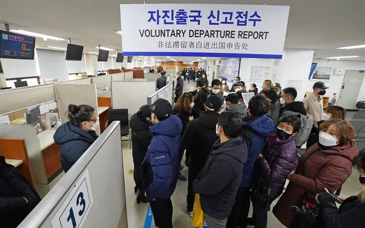 Người nhập cư không có giấy tờ xếp hàng để điền vào thẻ xuất cảnh tại văn phòng Cục Quản lý Xuất nhập cảnh Hàn Quốc ở Seoul (Ảnh minh họa: Yonhap)