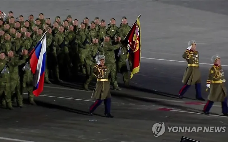 Quân nhân Triều Tiên diễu hành với cờ Nga trong một cuộc duyệt binh nhân kỷ niệm Đại hội Đảng Lao động Triều Tiên lần thứ 9 (Ảnh: Yonhap)