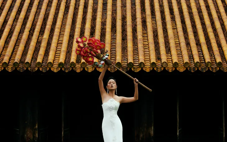 Diễn viên phim "Địa đạo" nói cô yêu thích các mẫu váy cưới cô mặc làm mẫu trong bộ ảnh lần này. Cô cảm nhận được sự sáng tạo của NTK khi đưa nghệ thuật thêu truyền thống Việt Nam kết hợp cùng thêu tambour, làm hoa 3D Nhật Bản, hay công nghệ cắt laser, khiến mỗi bộ váy chứa đựng cuộc đối thoại nghệ thuật - văn hóa thú vị. Hoa văn trên tường cung An Định khiến mỗi chi tiết thiết kế trên mẫu váy cưới càng thêm nổi bật.
