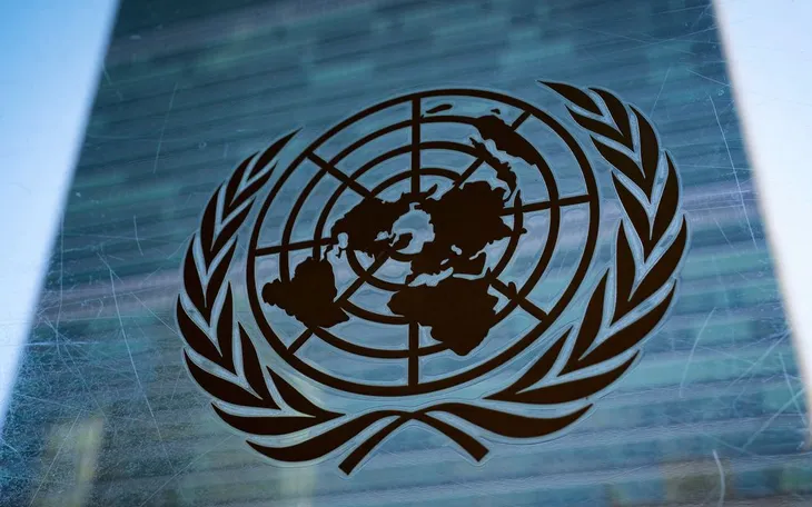 Biểu tượng Liên hợp quốc bên ngoài Tòa nhà Ban Thư ký tại trụ sở Liên hợp quốc, ngày 28/2/2022 (Ảnh: AP)