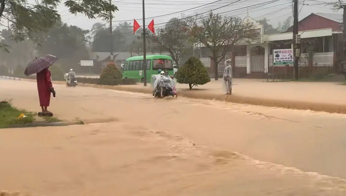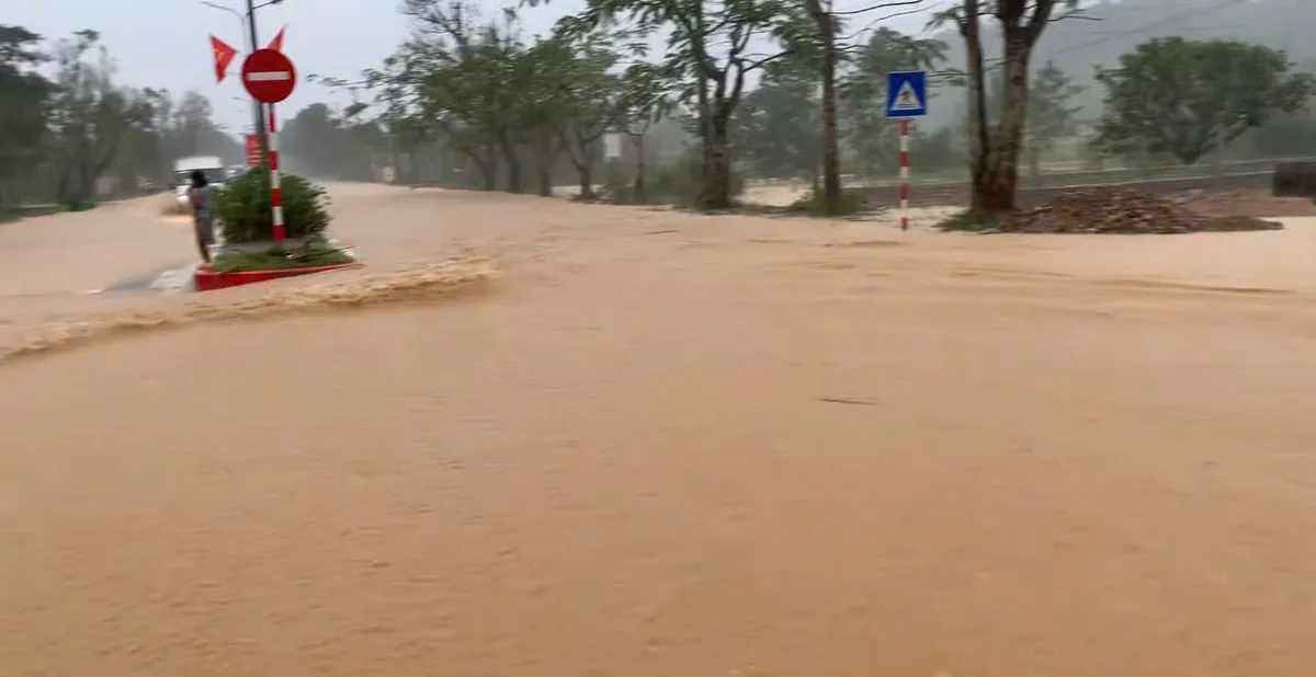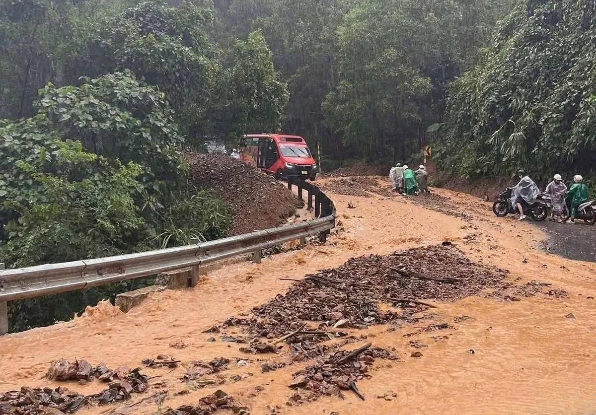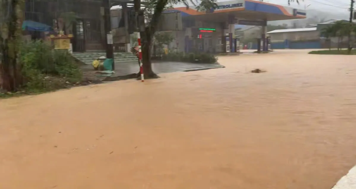 Mưa gây ngập đường Hồ Chí Minh qua xã A Lưới 2.